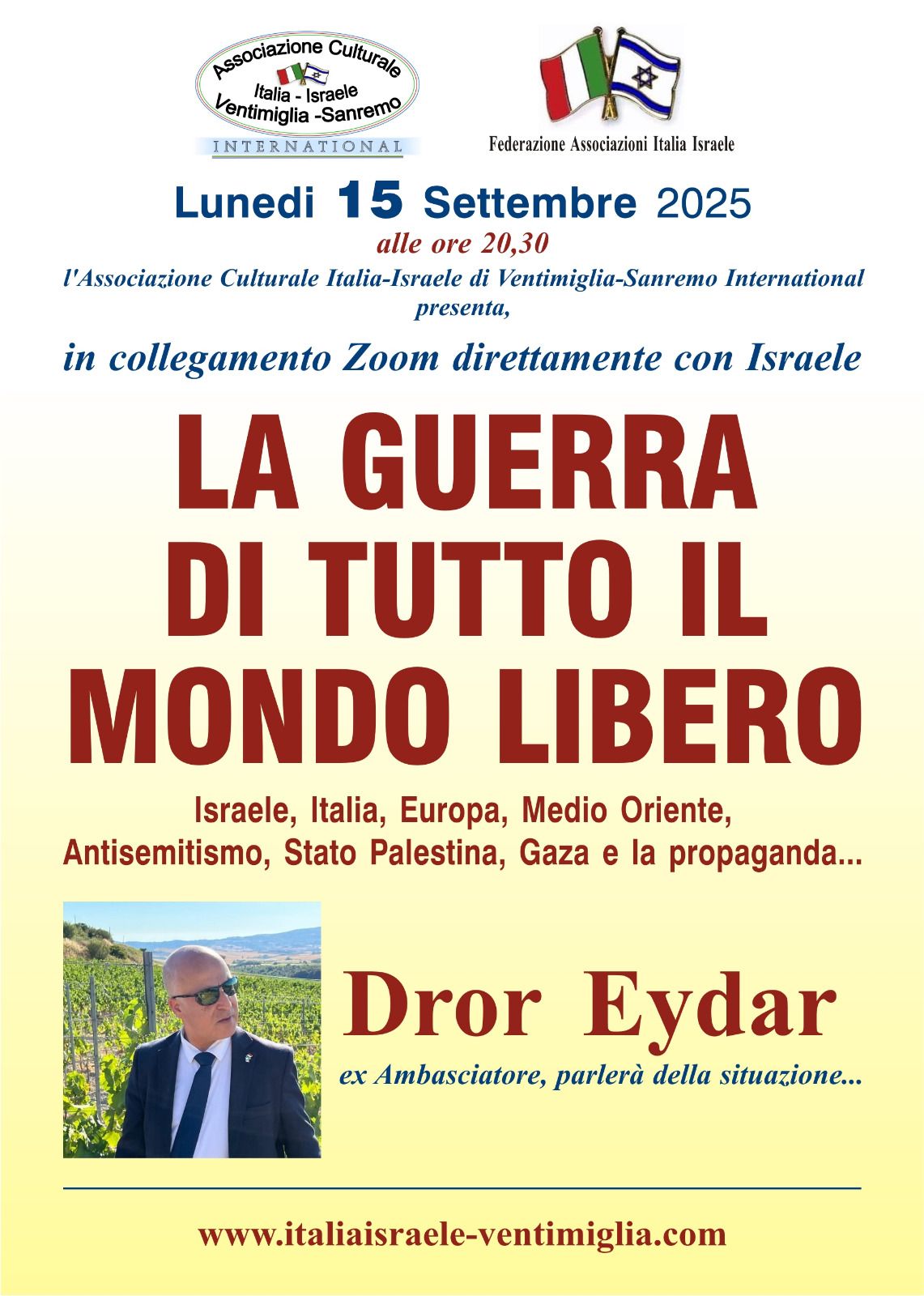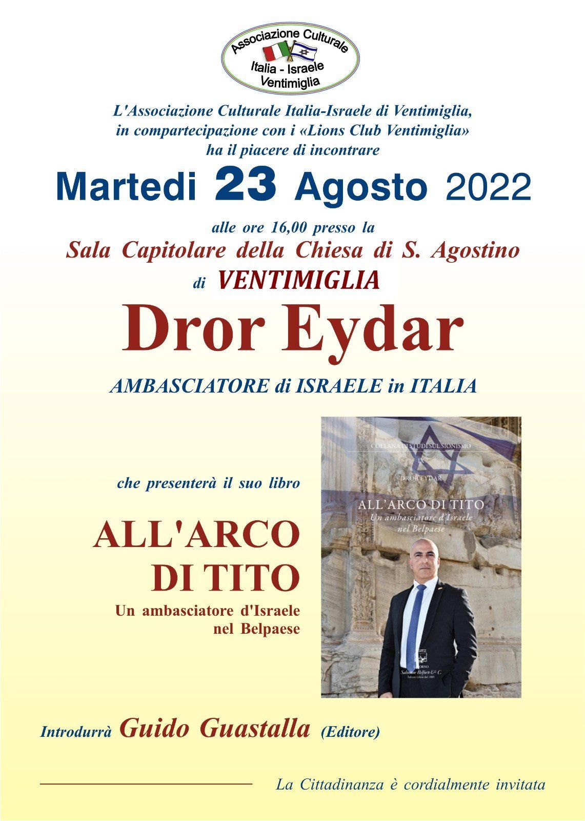 L' Associazione culturale Italia Israele di Ventimiglia, insieme ai Rotary club, ha piacere di avere ospite l'ambasciatore Dror Eydar, presso l'albergo Bel Soggiorno di San Remo.