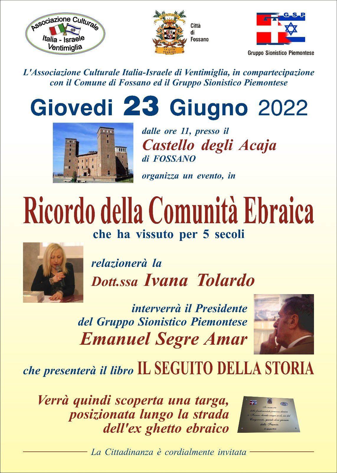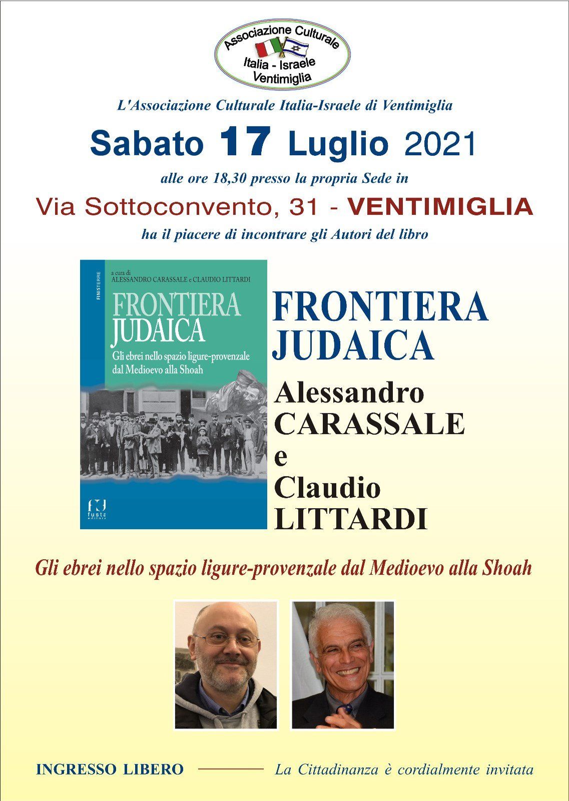 presso la sede della Associazione culturale Italia Israele Ventimiglia, Via Sottoconvento 31,sara' lieta di presentare Alessandro Carassale e Claudio Littardi, ed il loro libro. Frontiera Giudaica, gli ebrei nello spazio Ligure Provenzale, dal medio evo alla Shoah'.!!